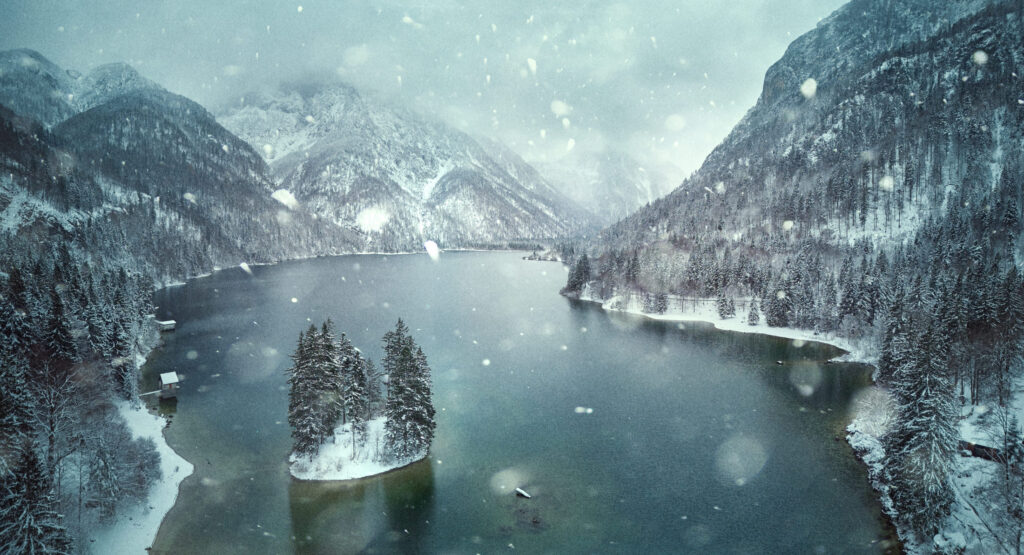 Vom klassischen Zugang aus, mit Blick auf die kleine Insel, zeichnete sich plötzlich ein Schneesturm am Horizont ab. Und dann ging alles schnell: Innerhalb von zwei Minuten zog ein heftiges Schneegestöber über den See. Ich hatte das Material mit der Brille bereits im Kasten, also schickte ich die Drohne noch einmal hoch – einfach, weil es sich richtig anfühlte.